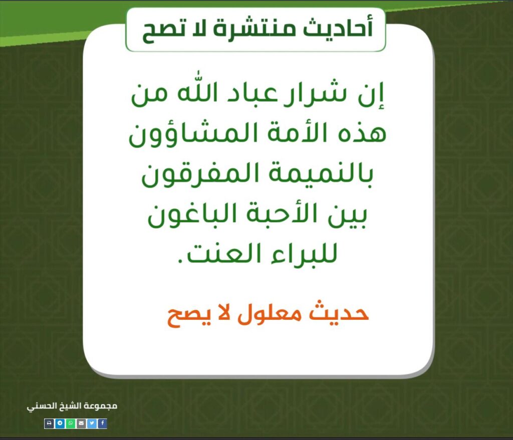 إن شرار عباد الله من هذه الأمة المشاؤون بالنميمة المفرقون بين الأحبة الباغون للبراء العنت. حديث معلول لا يصح